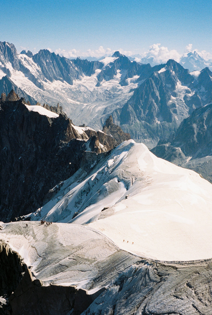 Bring the thrill of high-altitude adventure into your home with this stunning photo wall art. Captured in the French Alps at Mont Blanc, this custom analog photo print for your wall showcases brave climbers navigating the razor-thin ridges, surrounded by an endless sea of towering peaks. Their determination, set against the stark contrast of snow and rugged terrain, embodies the true spirit of exploration at the roof of Europe. Captured from the Aiguille du Midi, a 3842-meter peak in the Mont Blanc massif of the French Alps in Chamonix.