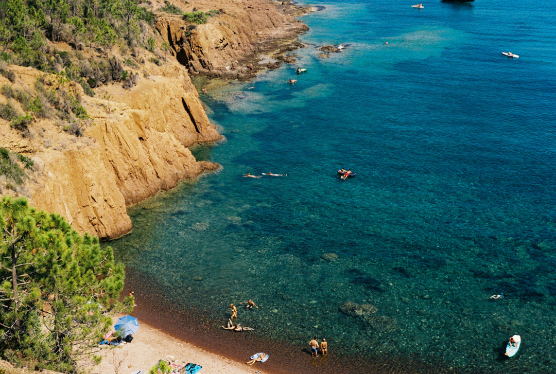 Bring the stunning beauty of Cap Roux on the Côte d'Azur into your home with this breathtaking analog photo print. Captured on Kodak Gold film, this custom print for your wall highlights the vibrant contrast between the bright blue waters of the Mediterranean and the red rocks of the coastline. People cool off in the crystal-clear sea, while the natural charm of the area shines through, perfectly embodying the idyllic summer experience of the French Riviera.