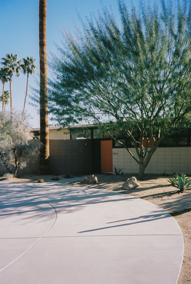 Bring a piece of Palm Springs into your home with this stunning photo wall art. Featuring a dreamy tree in front of a midcentury modern home, this analog photo print for your wall captures the timeless charm of the desert. In the background, tall palm trees sway gently under the warm California sun, completing this serene and stylish composition. Taken during a road trip through California.