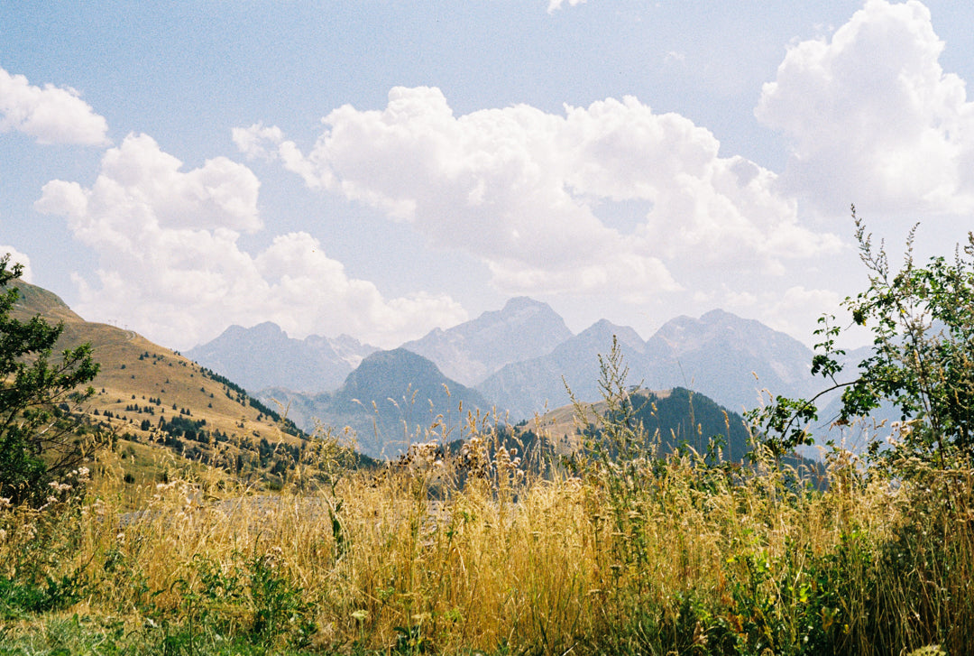 Bring a piece of the French Alps into your home with this stunning photo wall art. Featuring the serene beauty around the Alpe d’Huez, this custom analog photo print captures a breathtaking landscape where golden blades of grass sway gently in the foreground, framing lush green valleys and fading mountain peaks. The blue sky, dotted with soft white clouds, completes this picture of alpine tranquility. Taken during a road trip through France.